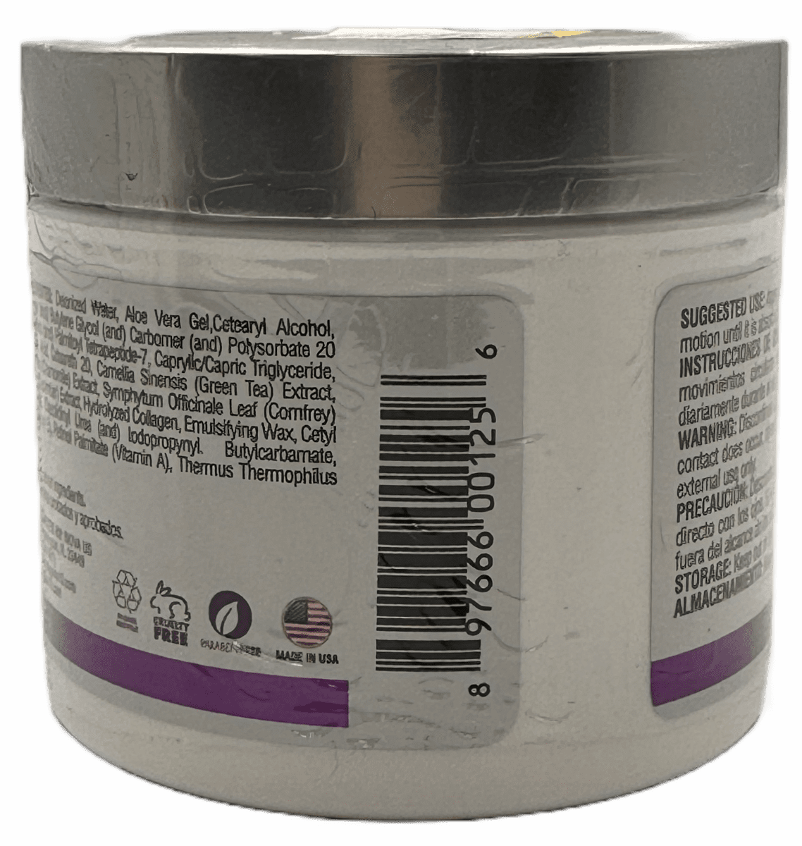 Deionized Water, Aloe Vera Gel,Cetearyl Alcohol,Propylene Glycol, Glycerin (and) Butylene Glycol (and) Carbomer (and) Polysorbate 20 (and) Palmitoyl Oligopeptide (and) Palmitoyl Tetrapeptide-7, Caprylic /Capric Triglyceride, Goyl Stearate, Stearic Acid, Ceteareth 20, Camellia Sinensis (Green Tea) Extrad Extract, Cucumis Sativa (Cucumber) Extract, Hydrolyzed Collagen, Emulsifying Wax, Cety Matricaria Recutita Flower (Chamomile) Extract, Symphytum Officinale Leaf (Comfrey) Alcohol, Hyaluronic Acid, Diazolidinyl Urea (and) lodopropynyl Butylcarbamate, Tocopherol Acetate (Vitamin E), Retinol Palmitate (Vitamin A), Thermus Thermophilus Forment.