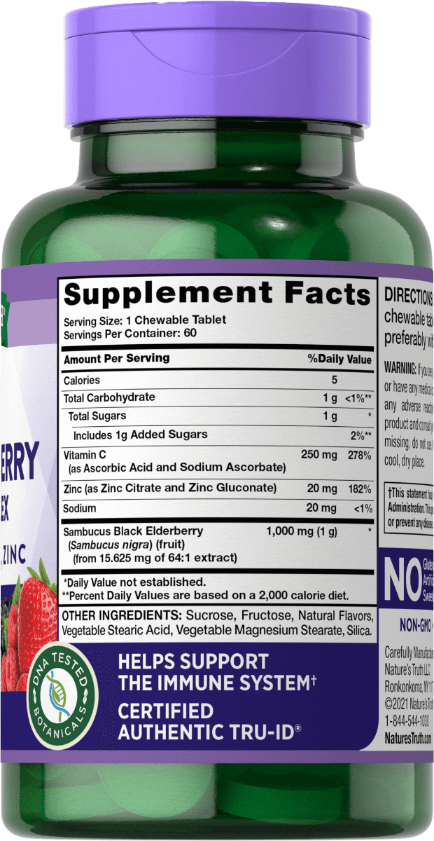 Nature’s Truth – Sambucus Black Elderberry Immune Complex Plus Vitamin C, Zinc Chewable Tablets – Natural Mixed Berry Flavor – 60 Ct