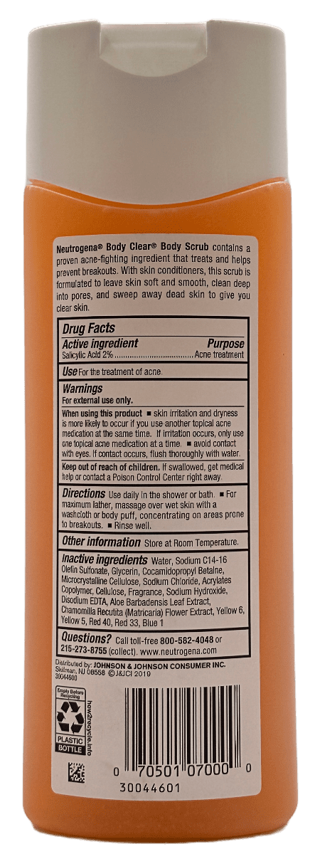Neutrogena Body Clear Body Scrub contains a proven acne-fighting ingredient that treats and helps prevent breakouts. With skin conditioners, this scrub is formulated to leave skin soft and smooth, clean deep into pores, and sweep away dead skin to give you clear skin.
