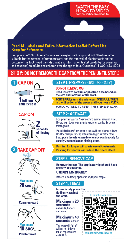 Compound W NitroFreeze is safe and easy to use! Compound W NitroFreeze is suitable for the removal of common warts and the removal of plantar warts on the bottom of the foot.